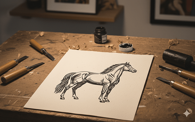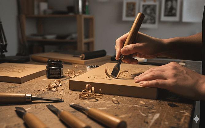 Step 2: Transfer and carve. If using lino, carefully carve away the white (non-printing) areas. Foam sheets can be pressed or indented with a pencil. The goal is to make raised areas that will catch ink and print onto paper. Take your time, working from the outside edges in.