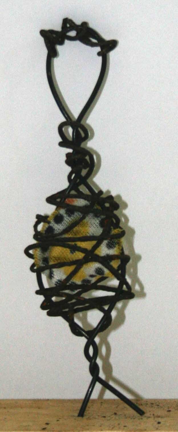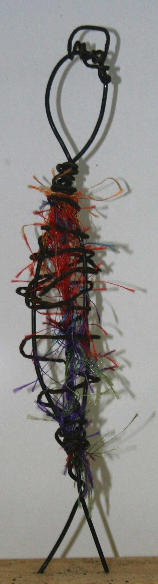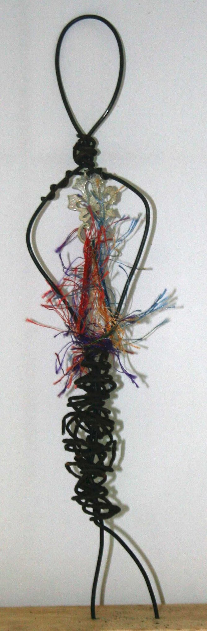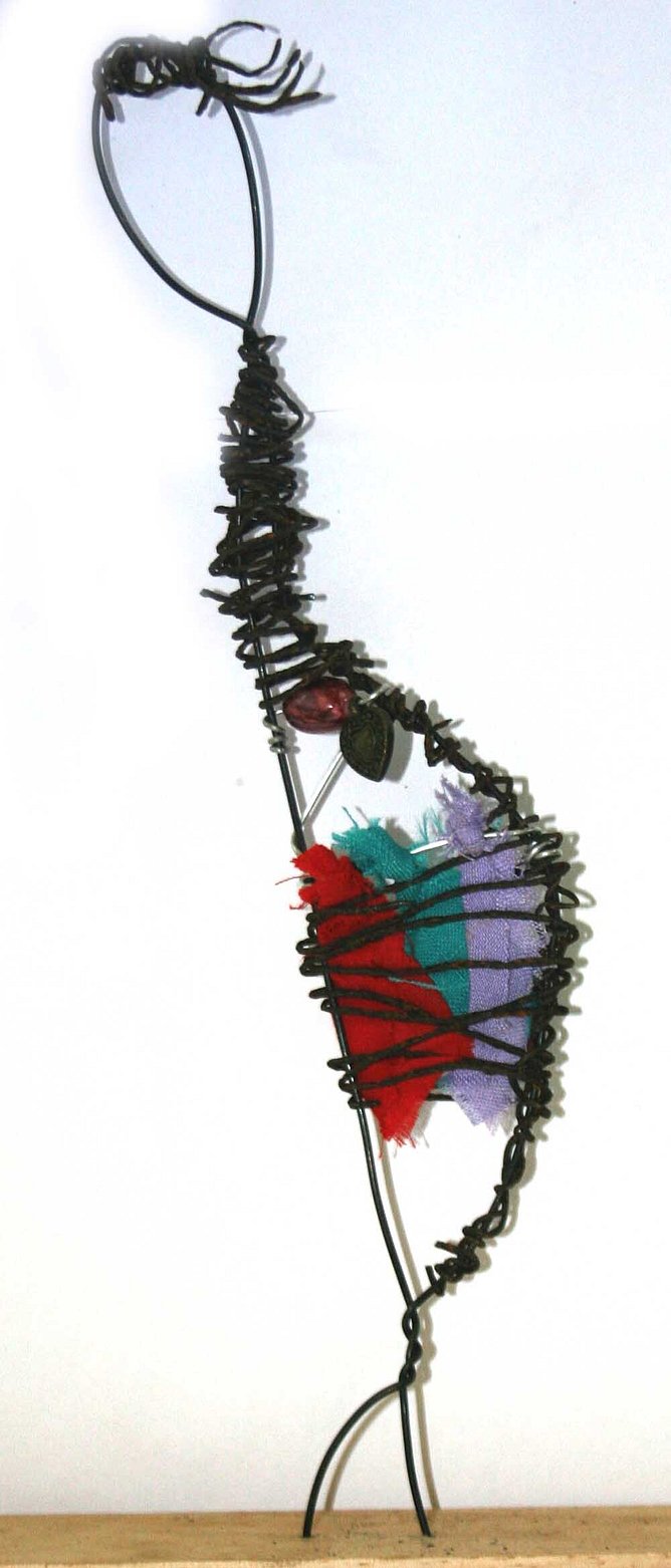 Fabric: Thread scraps of colorful fabric or frayed yarn through the wire ribs. This mimics clothing or internal "feelings."