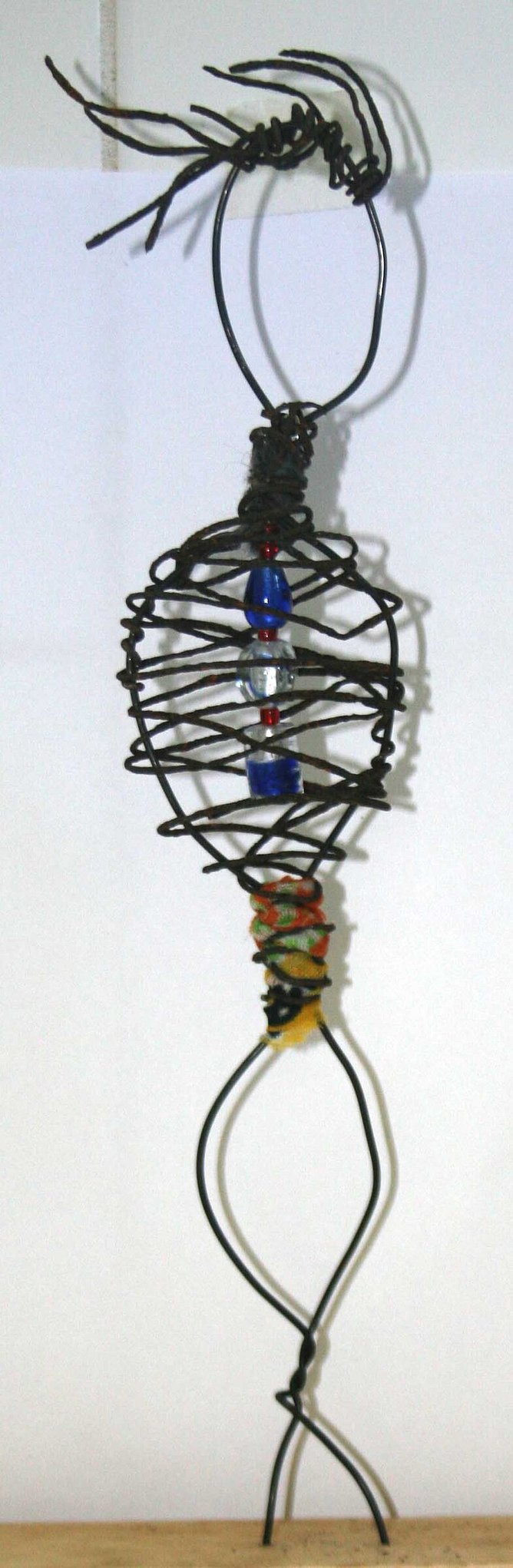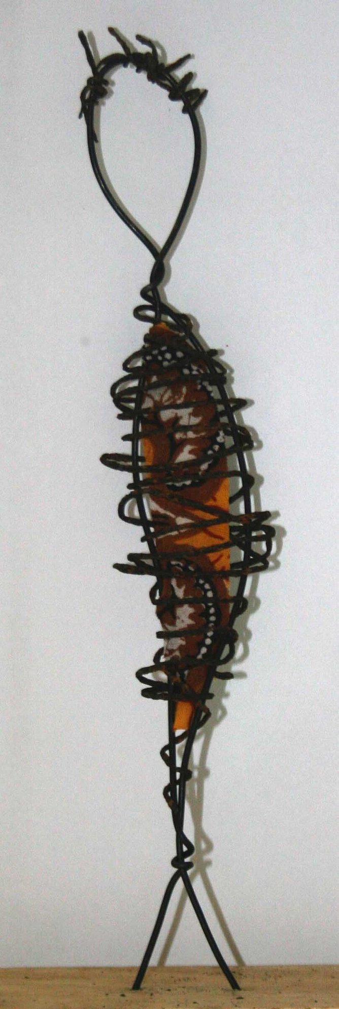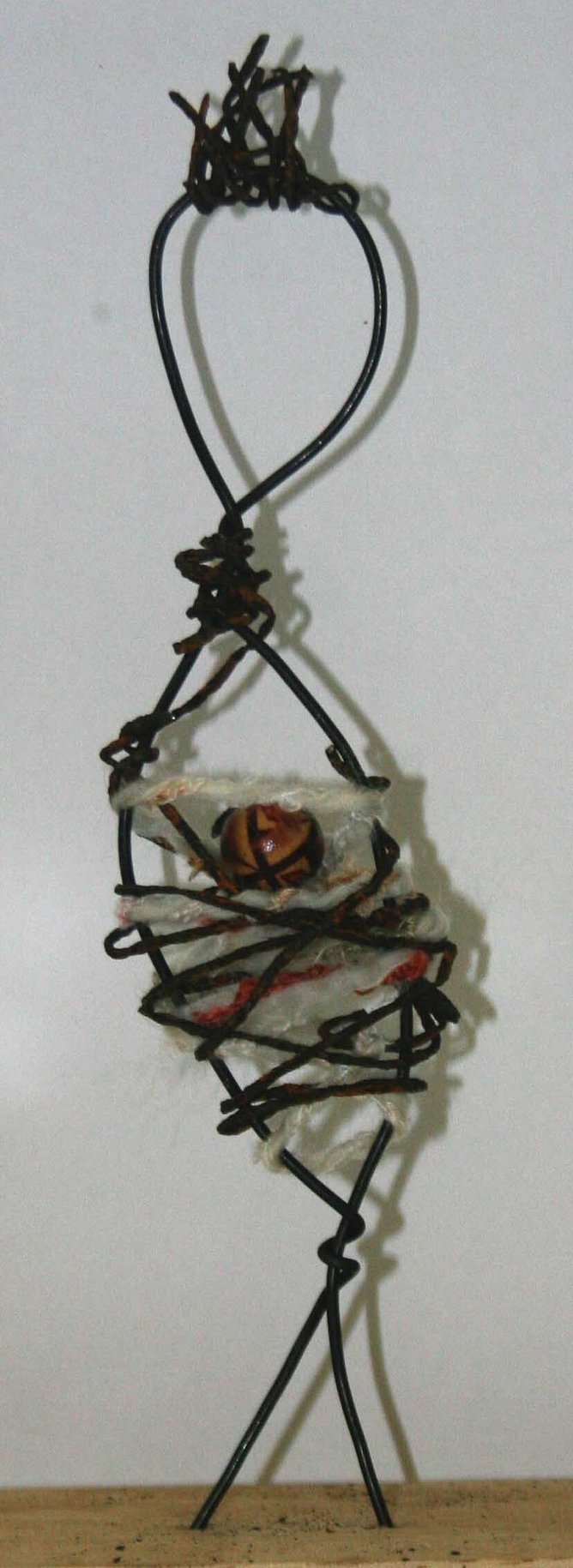 Fabric: Thread scraps of colorful fabric or frayed yarn through the wire ribs. This mimics clothing or internal "feelings."