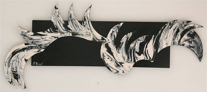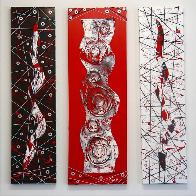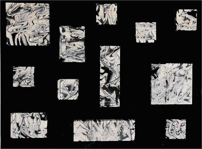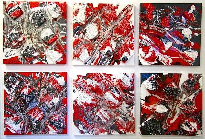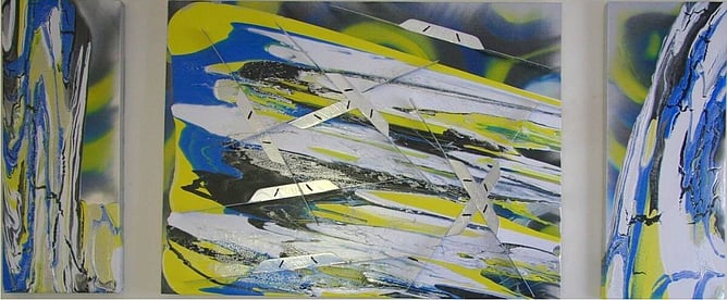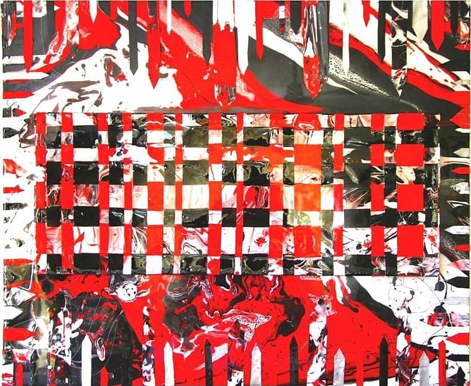 Often a lot of paint is wasted in the pouring stage, if your clever, you'll be thinking of secondary works at the same time your doing your first. I will have another canvas sheet under my work, to catch the left over paint, when l get enough, l simply cut the canvas into stripes, and weave them together. This can create a stunning effect. In the work above l even added stripes to the outside.