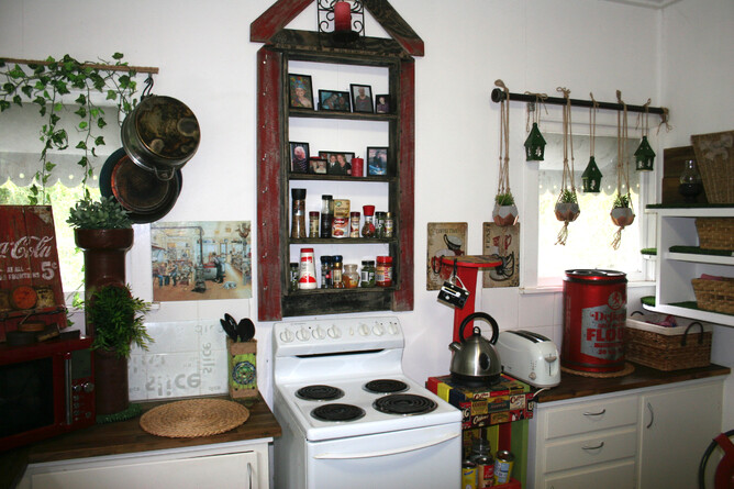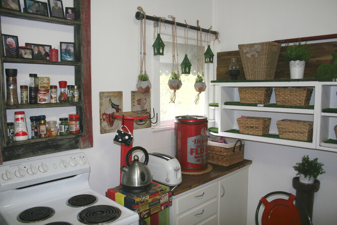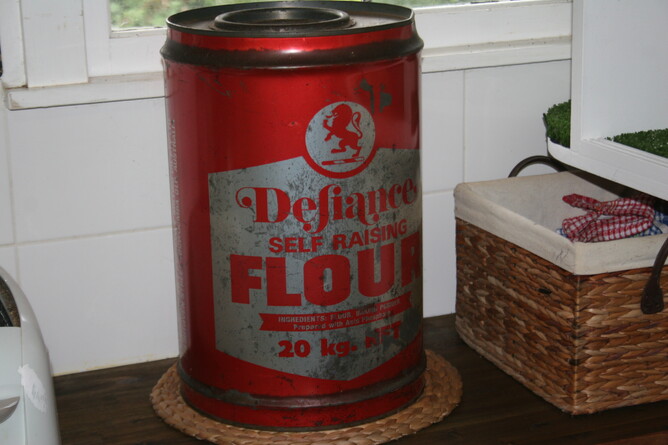 Using old metal tins, from biscuit tins to lolly and cereal tins and as pictured old flour tins, can put the collectable into your kitchen. Adding little signs or tin signs can add in your personality.