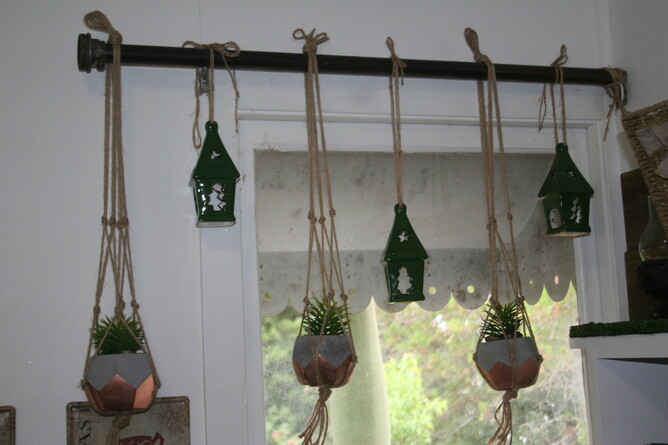 I went with a some super cheap little hanging pots and some old tea light candle holders l found on a throw out table at bunnings years ago, at least they now have a purpose. I used rustic twine to match my aged look and the look of the hanging pots. Different is innovative when it comes to decorating.