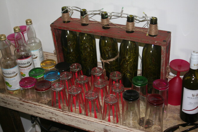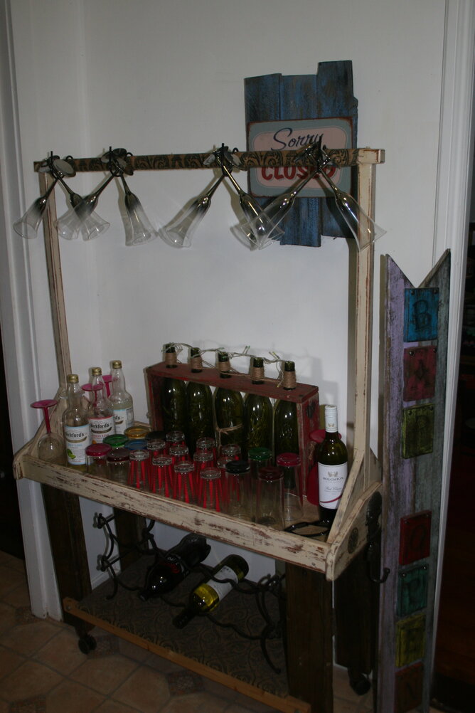 If you have the room, why not add a mini bar, l made one from an old tray (the cream painted area), l added chunky wooden legs on wheels, threw in an old wine rack l found at the tip shop, added a few garden hooks to the top to hang glasses from and done an awesome bar was produced. I made some funky bottle lights to (see next page) for how to make your own.
