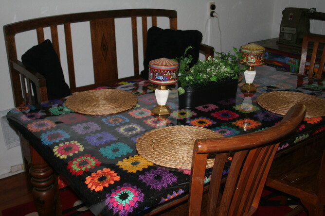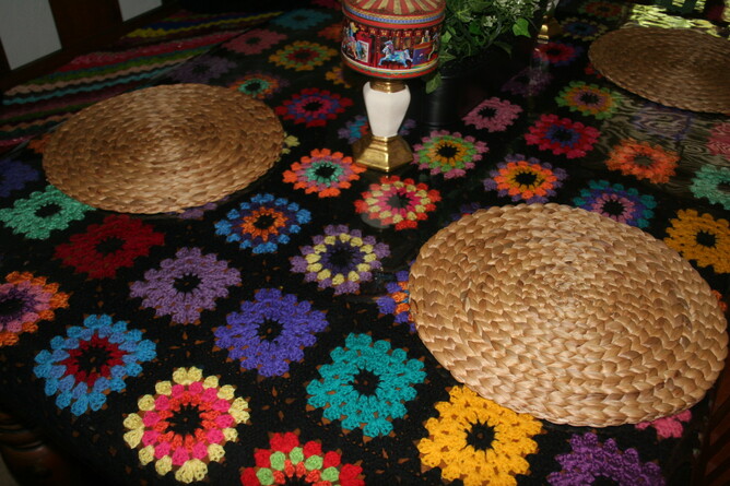 Last year my very talented mother crocheted me a rug, l loved it so much l actually had attached it to a canvas, but found it was a bit to strong on a wall, so... well you can see where it ended up, on my table.