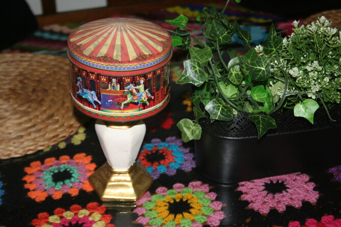 My accessories are two old biscuit tins simply glued onto to old candle sticks, l have drilled holes in the bottom of the tins and a battery operated push on/off light for $2 sits in each tin, it looks great because the light filters out the bottom of the tins shining down onto the table setting a nice dinner ambiance.
