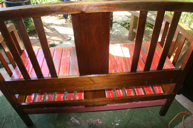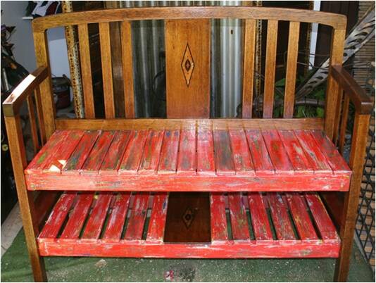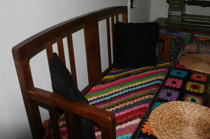 The long chair at my table, l made from an old double bed head and the bed slats, by directing simple beds you can really make some funky chairs, splash of paint and varnish and sensational bench chair for approximately $30. All l did was cut the foot bed head in half and attached them to the ends of the head bed head. Then created two platforms to fit the between measurements and screwed them into place. I added another mother knitted rug and some old cushions and a fun dining area.