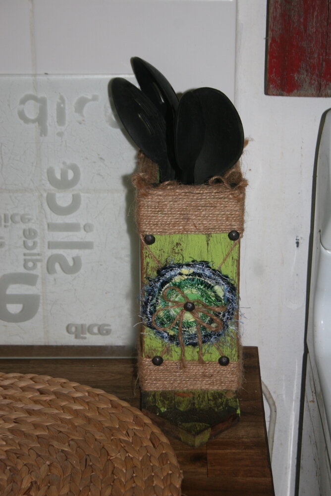 Anyone can get 4 pieces of timber the same length and build a rectangle, that is far from rocket science! Place a bottom on and you have a utensil holder for cutlery through to your cooking utensils, add a bit of paint and glue gun on some twine, add a few upholstery tacks for decoration and again it brings so much quirkiness to your kitchen as well as functionality