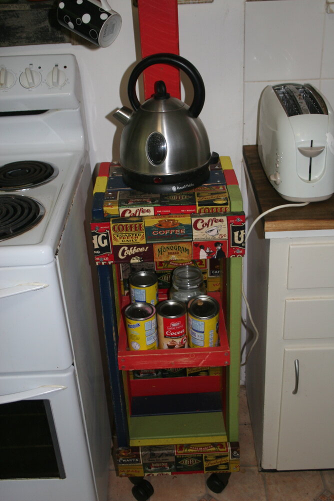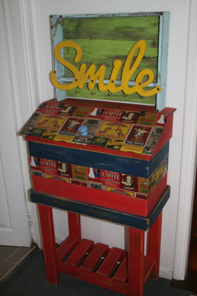 It works because it has purpose and meaning. I painted it different colours, sanded it back to achieve an aged look, then covered certain timber with a coffee collage fabric.
