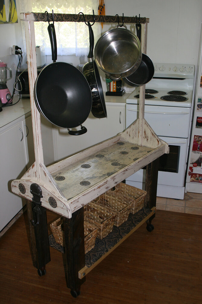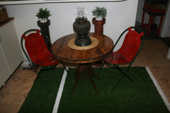 If you plan to add a table to your kitchen, keep it in theme with your kitchen! There is nothing worse than seeing a great recycled kitchen let down by a shinny new table. Old electrical cable wheels make awesome table tops, put it on an old metal outdoor table legs (remove the top) the rustier the better.
