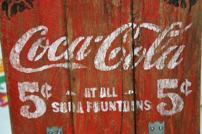 I then painted my wood red and gave a heavy hand sanding with a coarse sand paper to strip back the paint, again achieving that aged look. I purchased a coca cola stencil from ebay and using an old kitchen sponge dabbed on some white paint, don't worry about being perfect, your going to sand it back anyhow, and those minute leaks under the plastic stencil l promise will look the part.