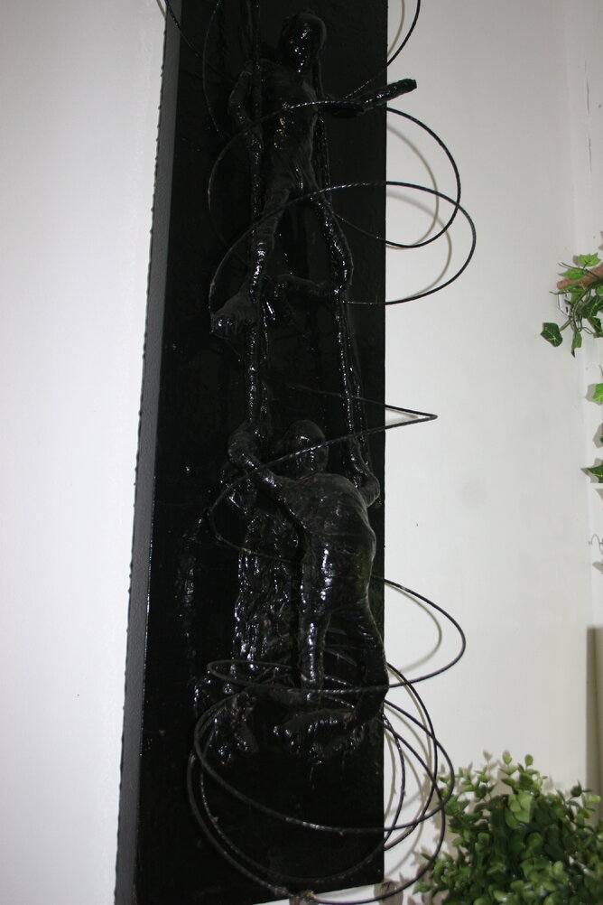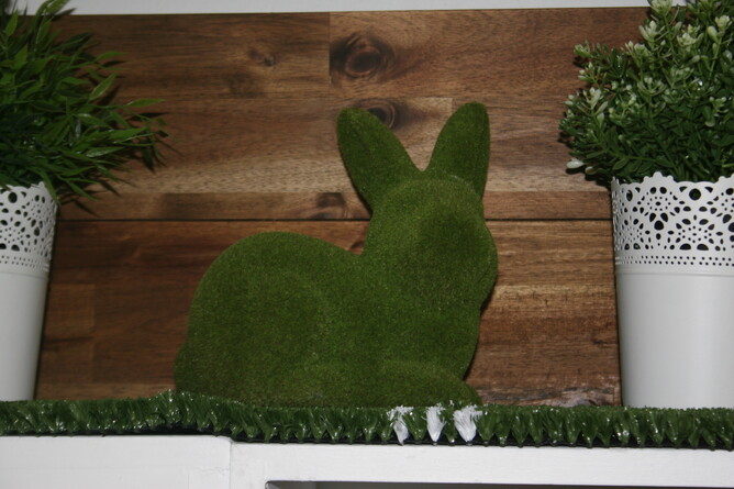 I used new fake plants, crisp white pots, a bunny covered in fake grass, and Balinese candle holders, but it is the bunny that is the centre piece of my feature wall, it stands out because as you know bunnies are not green, so having a juxtaposition in your setting, throws people off (juxtaposition = something that should look the same but looks totally opposite then it should look, i.e. green bunny instead of a white or grey bunny)