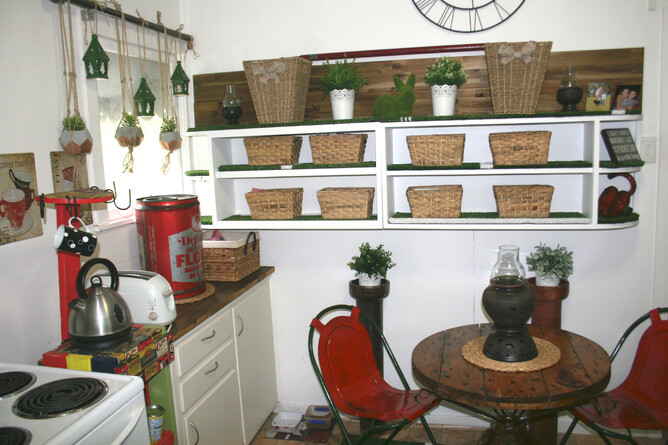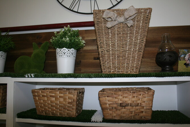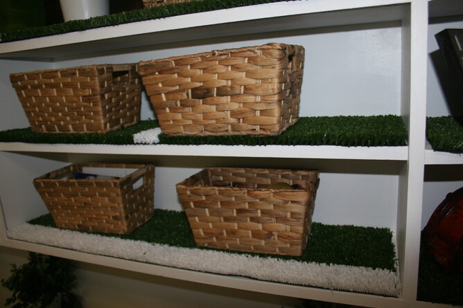 Like my fake grass floor rug, l added my second piece of fake grass and lined my shelves which gave the perfect cohesion from top to bottom and really gave a richness to my dirty old white painted shelves. The fake turf only cost me $20, so that was one cheap decoration.