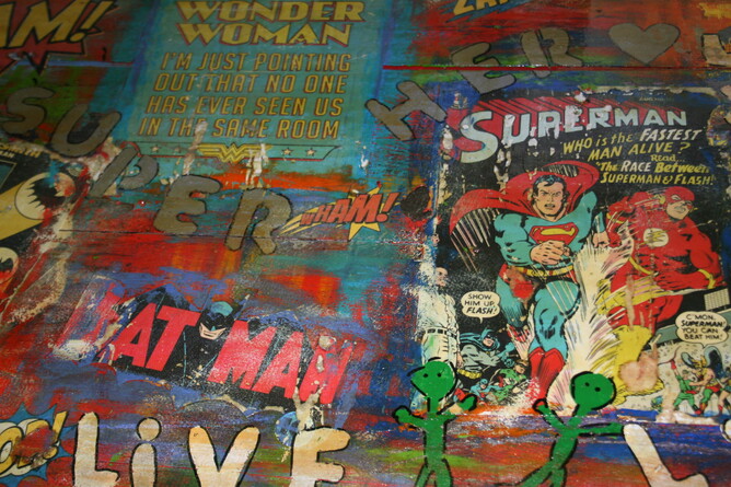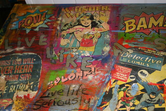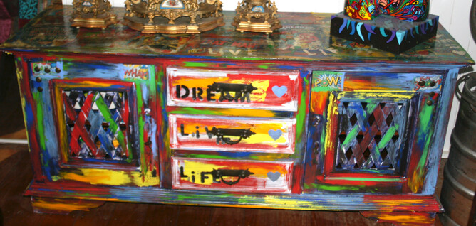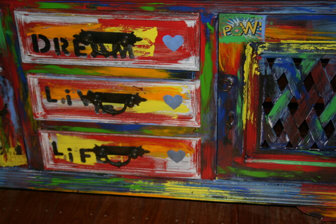 Another piece of furniture l have in this room is an old brown buffet, that l really was ready to throw out, then one day l got motivated and decided to paint and decorate it instead. The top l went with a collage of superhero images and created an array of word stencilled writing and paint, l then sanded the whole thing back to distress it, which look great, l then gloss varnished it. The sides and front, l went with splashes of colour.