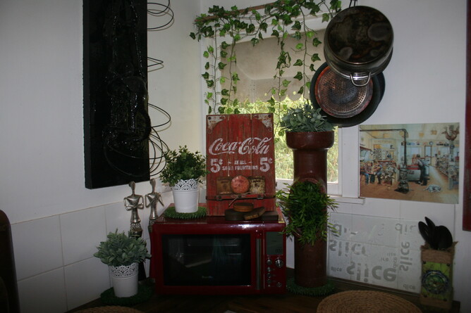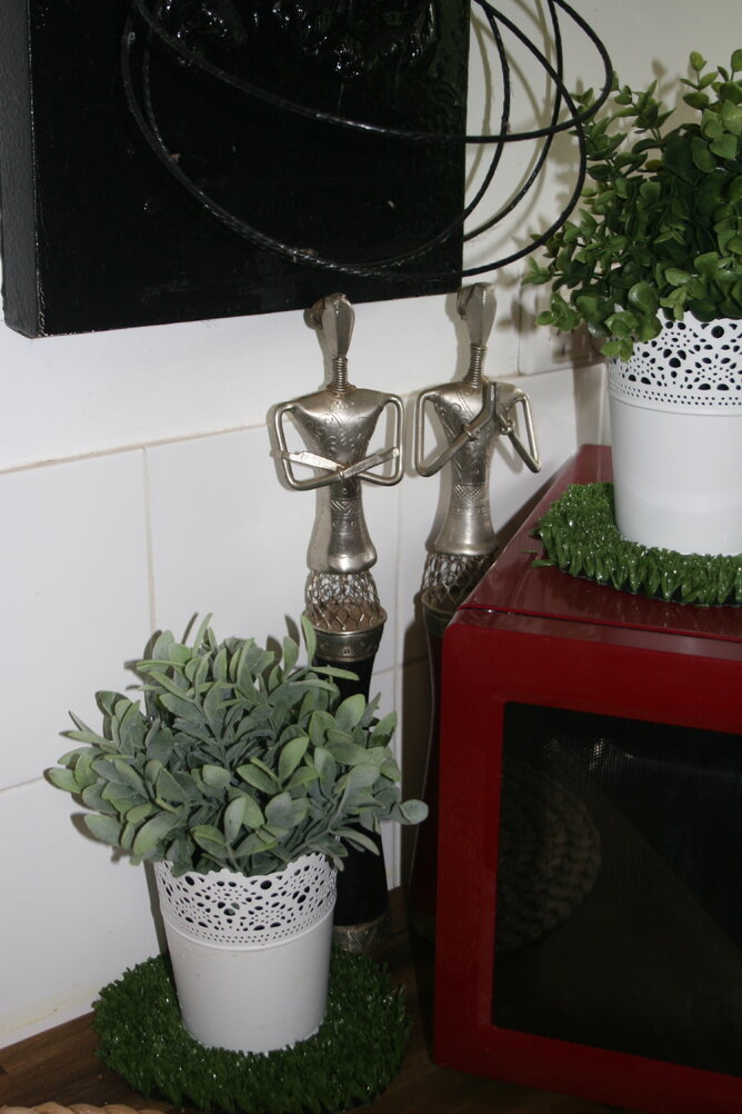 For my theme l decided to bring the outdoors inside, it's much easier to decorate when you have a theme in mind, so hit websites like pinterest, it has a wealth of decorator ideas, try putting in recycled kitchen and see what you can find into google. I find bring together a eclectic mix of old and new helps to stabilize your finished look to look chic and not cheap. They don't have to be expensive items, for e.g. I added white metal pots from Ikea, for $2.99 and added fake plants $5.99, that look so real, l even had to ask just to be sure, you can add real ones if you love gardening, but just be careful on your new timber bench tops that no water leaks. The green of the plants against the timber just goes so well (naturally) and the natural looking environment just makes one feel much happier and healthier.