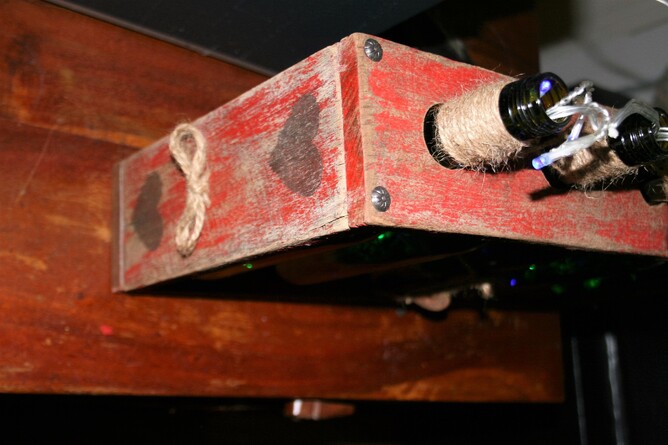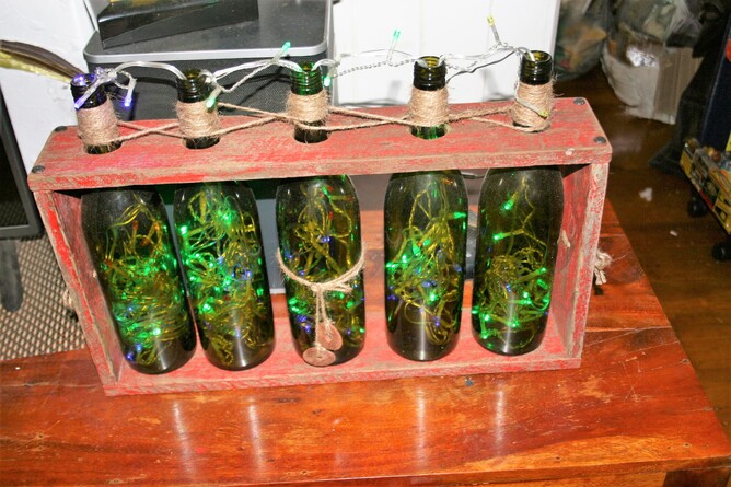 Bottle lights are so fun and cheap as chips, all you need is as many bottles as you want, some old fencing timber or pallet timber, a drill with hole drill bit bigger than the neck of your bottle, drill some holes in one piece of cut to size timber, making sure you have made sure all the bottles fits perfectly side by side, then create your timber rectangle, starting with the bottom and sides, do not add the top until you have added the bottles through the holes or you will never get them in later, paint it either before or after, but its much easier to paint it before you add the bottles, sand it back and then comes the fun bit – add your Christmas lights.