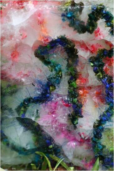 Makes for an interesting photograph, the way the ice cracks within the structure. This has lengths of wool knotted and encased