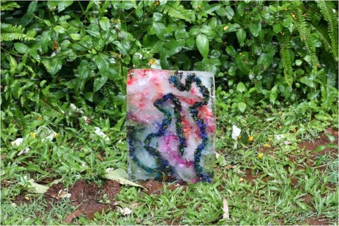 A unique way to use ice in art is by freezing objects inside it. One artist to look at is Nicole Dextras, who places vintage clothing in oversized ice blocks and creates striking photographs. She also crafts old-fashioned dresses from natural materials. Here’s a small-scale version I tried myself.