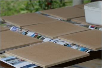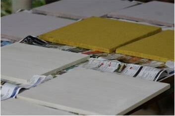 The next step is to cover them with 100% Acrylic ceiling paint (cheap) or Artist Gesso (expensive), use a roller for the best results, and lightly sand between layers when dry, do at least two layers. Tip: do multiple boards at once, this is quite a process so the more you do at once the more time you spend on the good stuff.