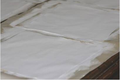 Paint on minimum 3 coats of 100% Acrylic ceiling paint or artist gesso sanding lightly between coats.