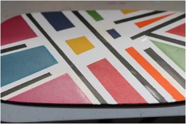 Artwork on glass, this could be done for table tops, by painting the underside of the glass in an abstract print.