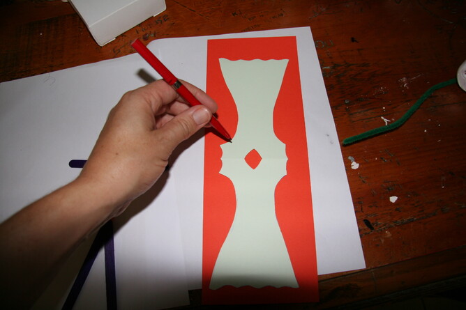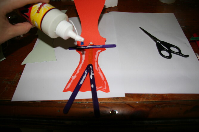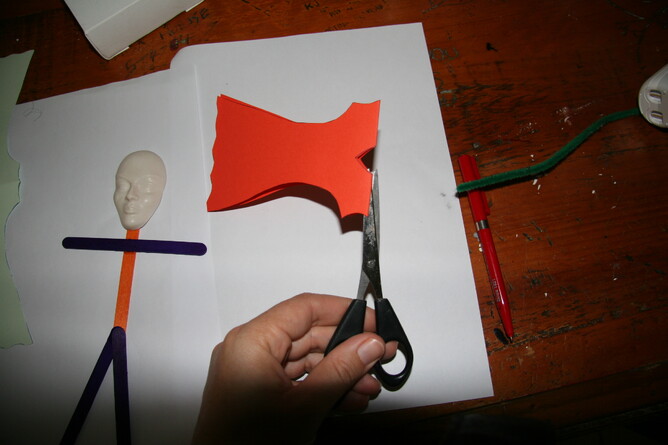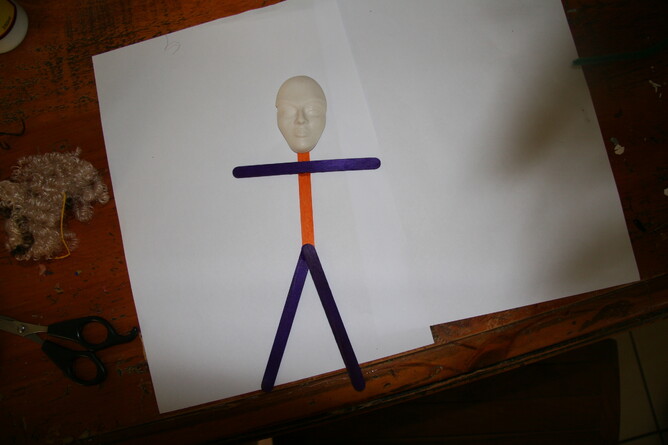 The trick to the body is to create a template, start by drawing a shape around your person then double it so you have a mirrored image, see above, children can them cut it out and fold it in half and simply pop around the stick body gluing both sides together.