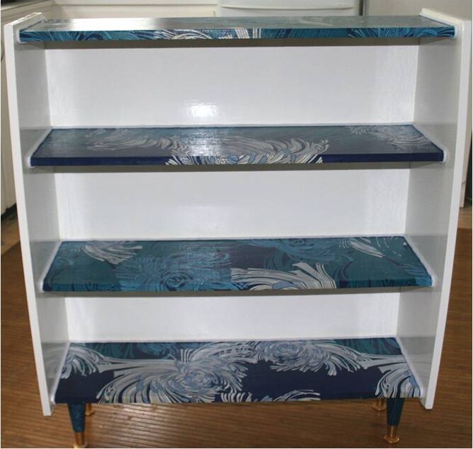 Old brown shelf unit...now ocean inspired beach house unit. By adding fabric (SEE MY LESSON ON ADDING FABRIC TO FURNITURE) you can transform old furniture into something amazing, vibrant and modern with a touch of vintage to it.