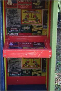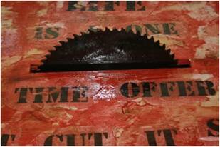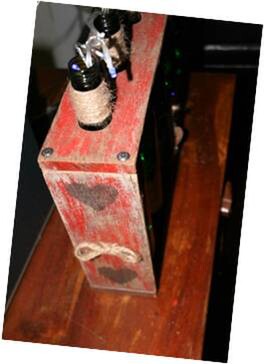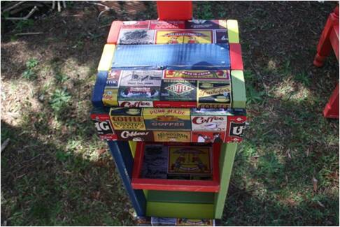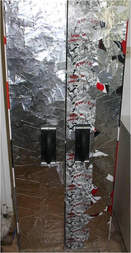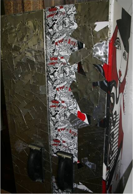 Made from scrap sheet metal, handles are sand paper pads, the artwork part is photographs of my art. Sheet metal comes in a roll and is easily cut by scissors, l then used tacks holding them with a pair of tweezers to hammer in the sheet metal.