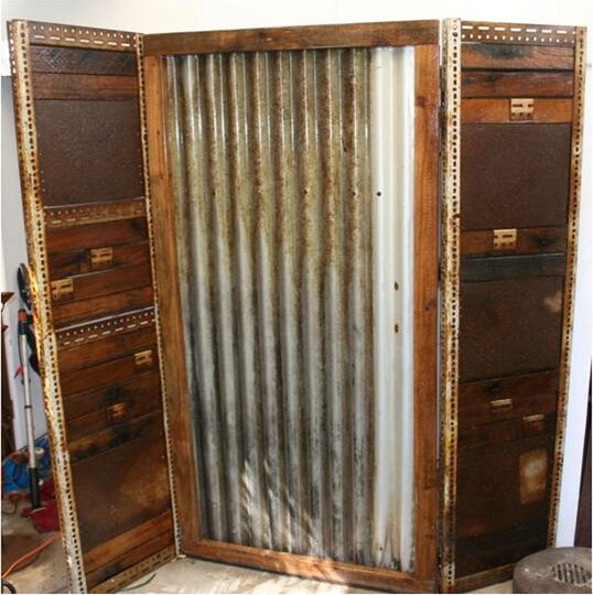 Recycled timber, corrugated iron and old metal shelving fantastically rusted, varnished it comes up a glossy treat transformed into this unique screen. Originally this was a metal shelf unit, l simply unscrewed it all, rearranged it and put it back together as a screen.