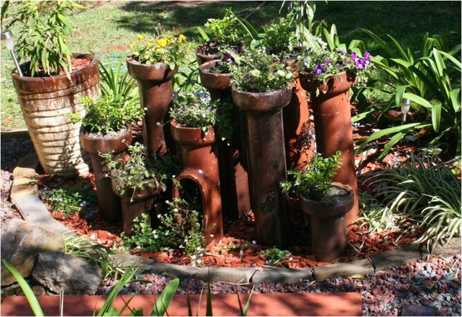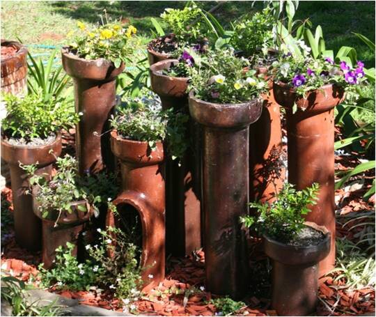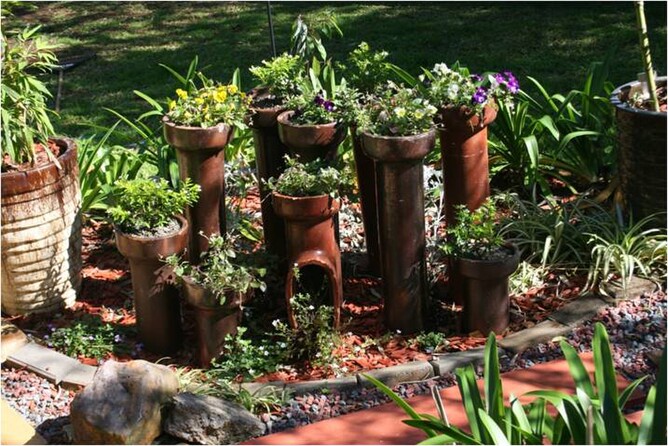 Old copper pipes make awesome garden pots for a sculptural garden.