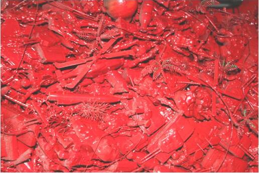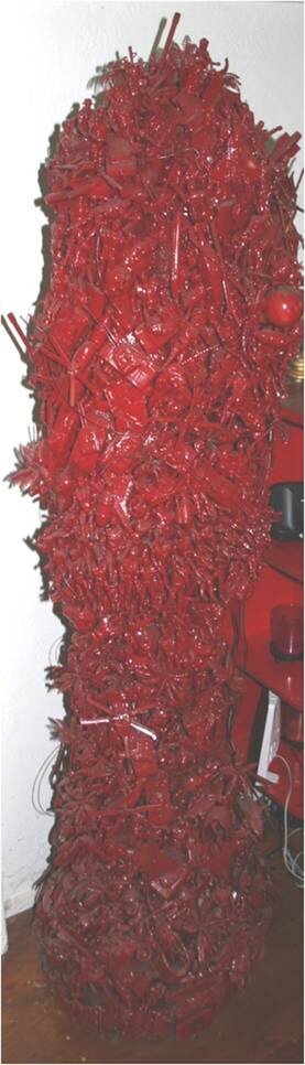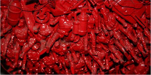 This is a light made from plastic army toys, it's quite large and 1.3 meters tall. All the toys are added to a wooden core using no nails glue, the light was woven in as the sculpture was made, and then everything was sprayed red and spray glossed.