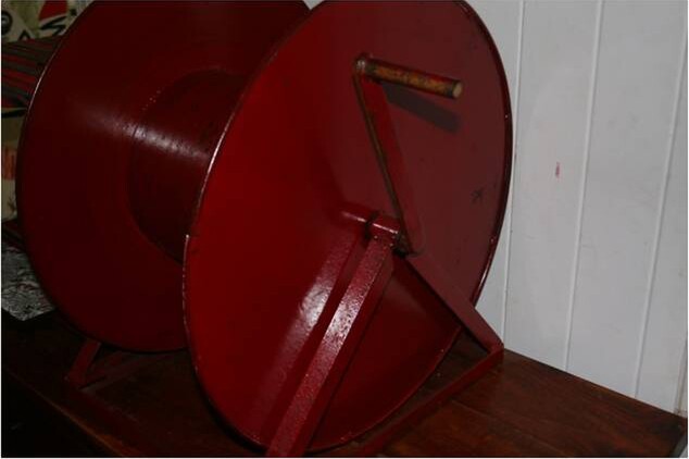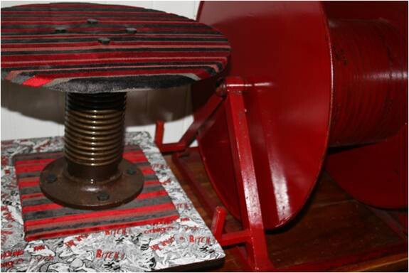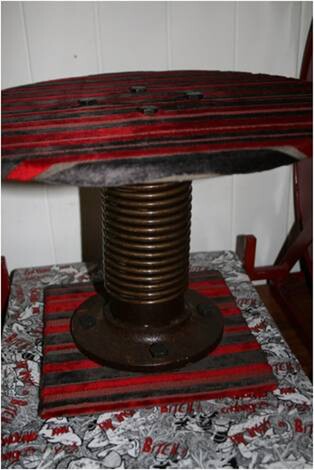 Who said that outdoor items can't come indoors and look fabulous. An old and large metal hose reel was originally yellow but with a good spray paint now red, and a giant spring now the leg for a side table. A quirky piece of furniture.