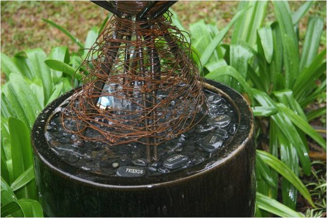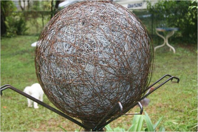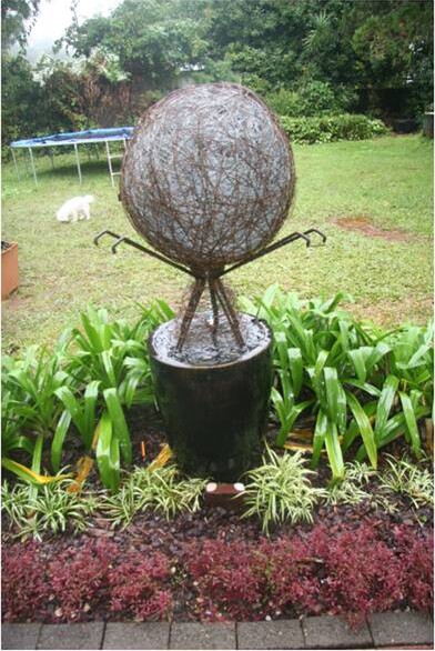 This was created using wire and lots of it, two different types, galvanised and rustable (It looks black when new), by combining both it gave a fantastic contrast, then just roll like wire like rolling up a ball of wool. It sits on the base of a table that was turned upside down and positioned into a pot with a water feature added and a light.
