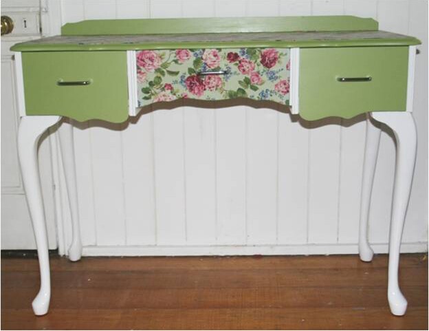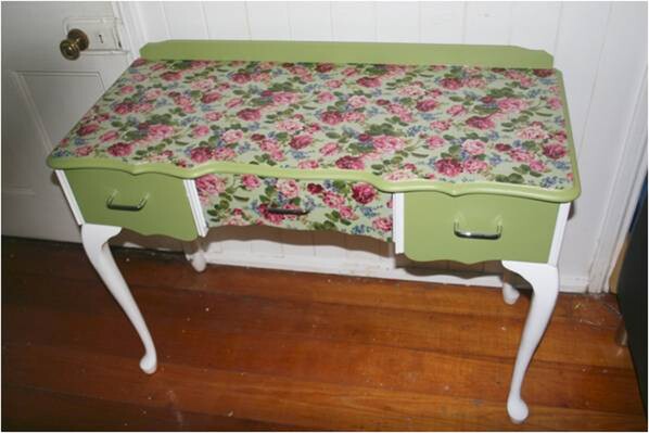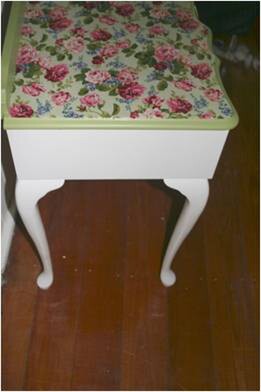 FURNITURE BACK INTO VINTAGE This was originally a kids table, painted pink with embellishments, though the style screamed vintage old, so by choosing the right fabric it turned back into that style and sold quickly.