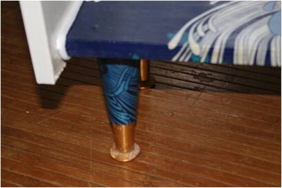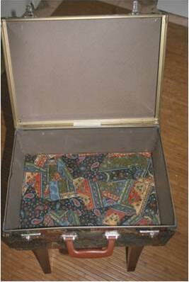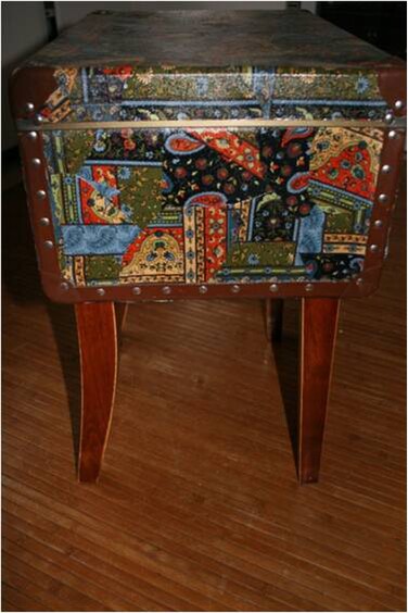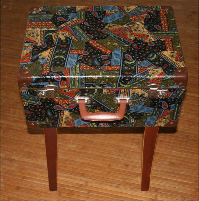 An old cardboard style case and chair legs taken from another old chair, positioned together to achieve this quirky piece. Because the case is only hard cardboard a base of MDF wood was positioned inside the case and the legs screw to that. Fabric was used to cover the case