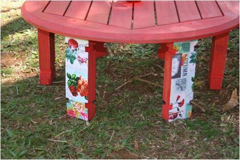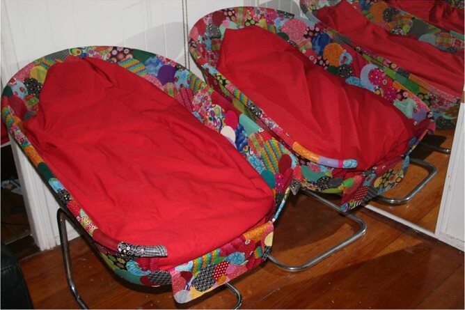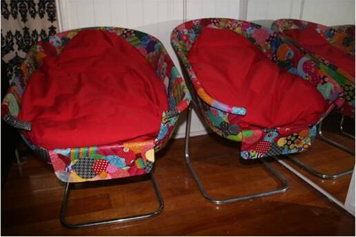 Often plenty of plastic wheel barrows at the tip shops and loads of chairs with metal legs. Combine the two and these bean bag chairs rock especially for kid's rooms. Collage with fabric over the barrow and gloss. These are nice, bright and super fun. And best of all cheap as chips!