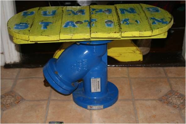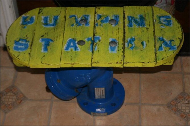 When l'm looking for odd items l always make sure that there's a way for me to attach it with minimal fuss. Take this blue piece of piping, there's no point buying it if l can't attach it, it was perfect because it had holes in it, so with a few bolts it's on, so now a novelty table. So easy to make money.