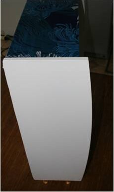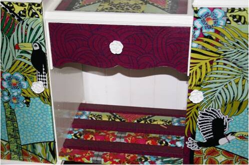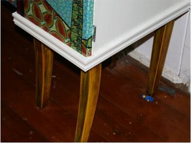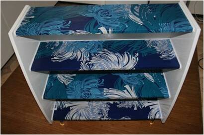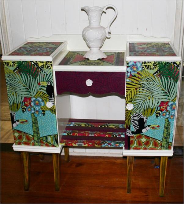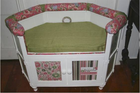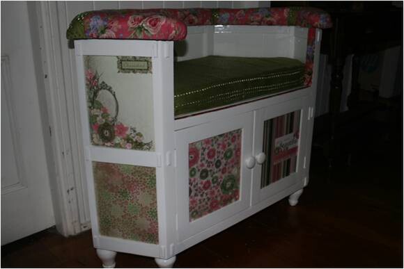 This was an old dressing table, l used chair legs and raised the height of the dressing table and inserted a slated base to the middle, even the vase is from the tip! It is covered in fabric. SEE MY LESSON ON ADDING FABRIC TO FURNITURE.