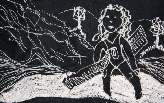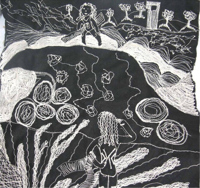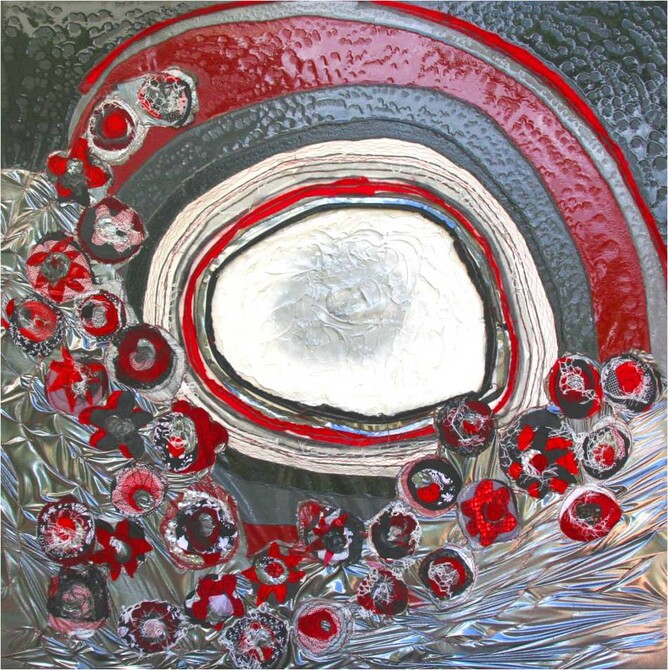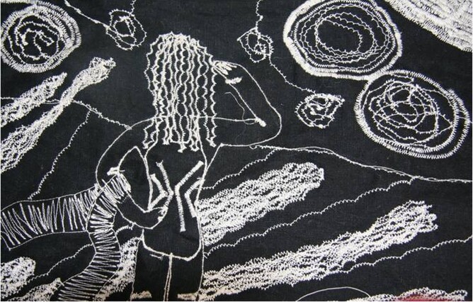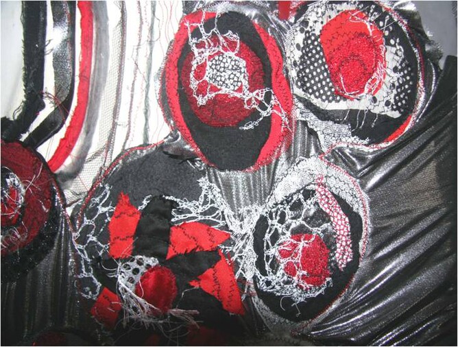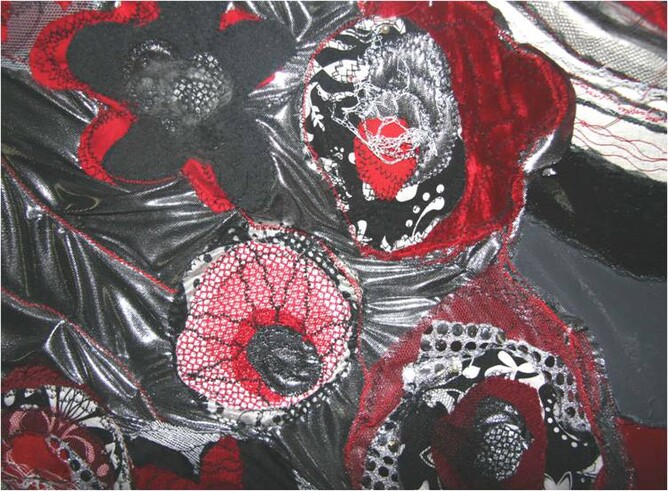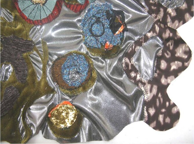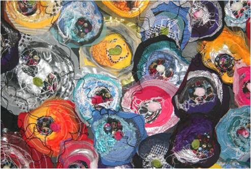 This work l wanted to try something bright and cheery, l wanted to represent a bunch of flowers done with fabric and adding more and more fabrics and using linear features to both join the fabrics together but also to be decorative at the same time.