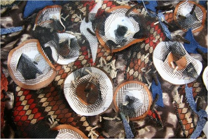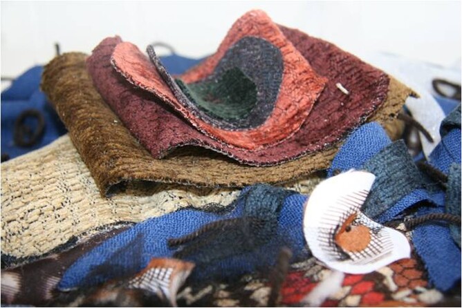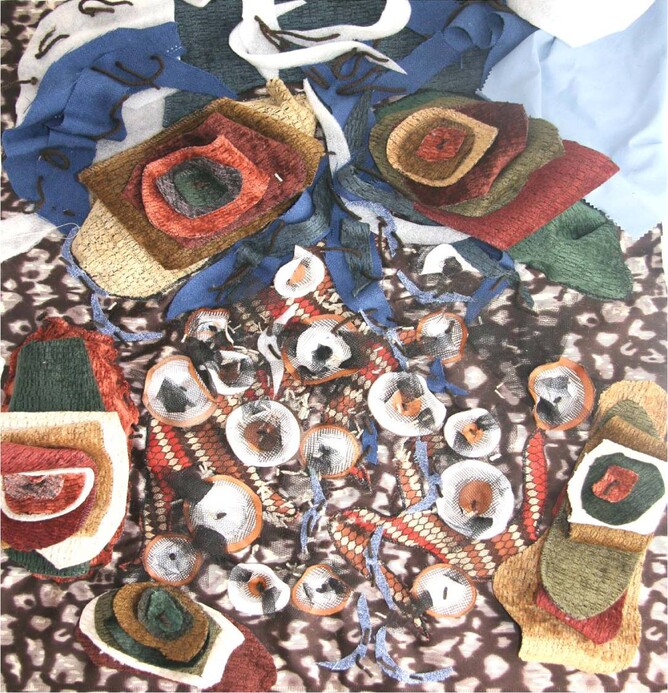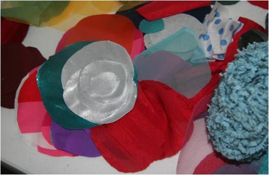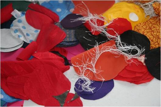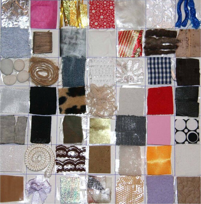 Collection of textiles. Foil, tissue paper, tissues, rope, wool, bark, leaves, cotton, plastic, latex, cardboard, lace, pebbles, bubble wrap, silk, satin, toweling, animal hair, fur, string, nylon, denim, leather , band aids, fabric, string, leaves, bark, tissue paper, denim, ribbon.