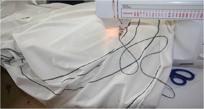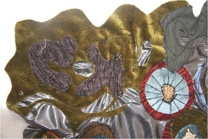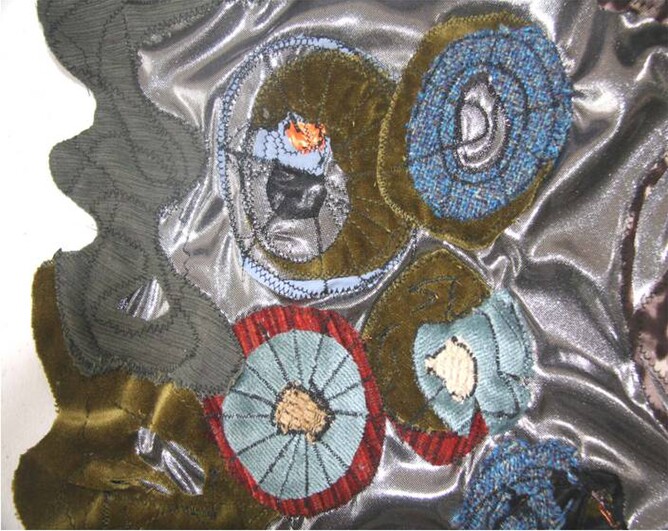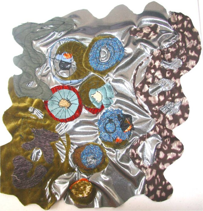 Step 2. The meteoroids were then sewn onto silver stretch fabric in a way that stretched the fabric, so that when finished the meteoroids would look as if they were being catapulted through space.