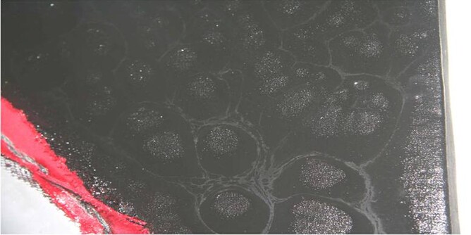 Step 7. Glass resin was added to the painted and gap filled areas, one very thin coat only was used, and l worked it to create pitted holes so it looked like a crater effect, which worked very well and adds a dimensional effect to the flat painted areas.