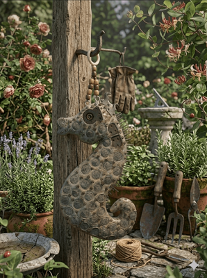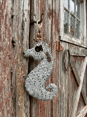 This one-of-a-kind seahorse sculpture is a sophisticated study in industrial upcycling. Crafted from a meticulously curated collection of found objects—including structural steel nails, vintage brass hinges, and geometric rivets—the piece transforms cold hardware into a graceful, fluid form.