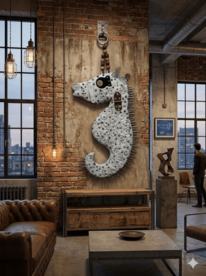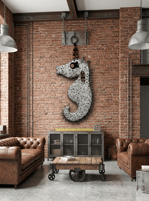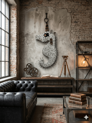 Completely shaped by hand this concrete seahorse delights with rustic metal accents, the essence of tiny mark making beads and tiny beads, thoughtfully and sustainably designed with recycled parts carefully selected and salvaged to bring new life to art.