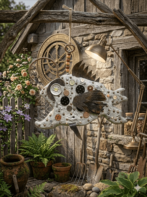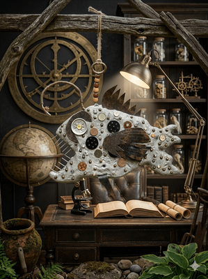 Look closely and you’ll find a treasure trove of repurposed industrial artifacts. From the texture of sheet metal to the geometric patterns of buttons and brass washers, every "scale" has a past life. These everyday objects are reimagined as biological armor, finished with a distressed metallic patina that suggests a creature forged in the lightless depths of a steam-powered ocean.