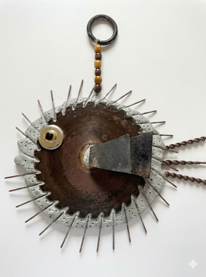 Handmade and created by artist Kaz Elzinga is this one of a kind original concrete and rustic metals Puffer fish hanging sculpture. Sustainably produced using recycled metals and parts to achieve a rustic finish and novelty look.