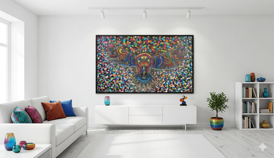 The level of detail here is staggering. By blending intricate, psychedelic linework within the owl’s silhouette against a backdrop of thousands of multicolored "cells" or dots, the painting creates a dual experience: