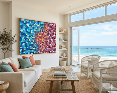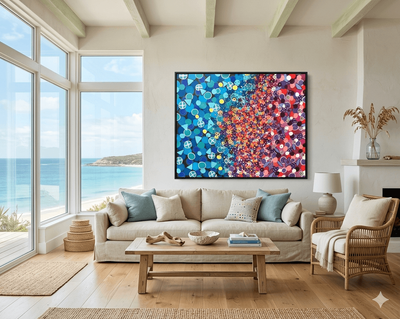 The Right Side: Shifts into a warmer palette of magenta, lavender, deep purple, and pops of bright red. Here, the circular motifs continue but are joined by swirling line work and star-like shapes.